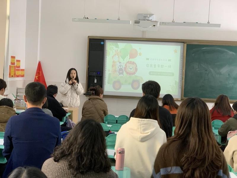 第二个环节是家长和孩子共同回忆童年生活中有趣的故事和喜欢的动画片,双方进行交流和分享。首先家长和孩子一起回顾和分享他们各自的童年故事,接着班主任播放一系列经典动画片的剪辑,唤醒家长和孩子的童年记忆,结合每组家庭带来的故事书,向彼此讲述小时候喜欢的动画片及人物角色。