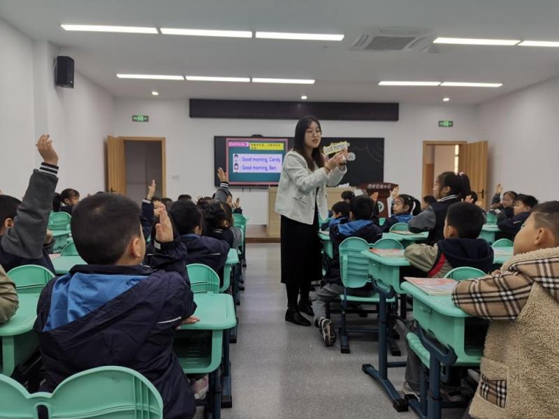 低年级组牛知礼老师执教1A Project1。牛老师准备充分,制作了精美的板贴头饰等教具,精心设计教学课件,板书设计也很用心。牛老师充分关注全体学生的学习状态,整堂课做到了让所有同学都参与课堂活动,同学们积极性高。