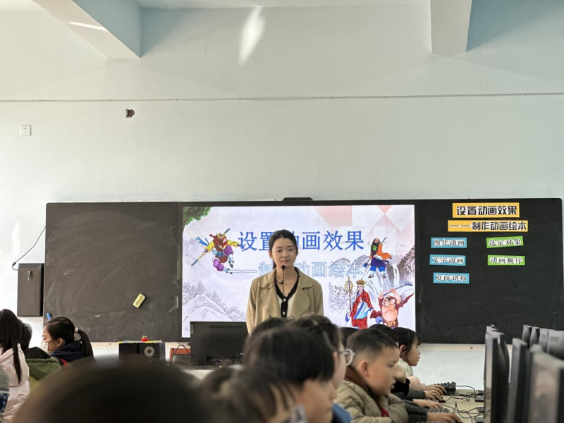 朱徐庆老师执教《设置动画效果》一课,用《三打白骨精》这个故事制作动画绘本的情境下进行。活动一图片动画,同学们自主探索,为人物添加效果,寻找绘本中人物合理的出场方式;活动二文字动画,在场景中有两段人物对话,同学们发现人物的对话是有顺序的,总结出添加效果时需注意动画顺序;活动三页面切换,在场景与场景的切换中,如何突出这是“绘本”动画呢?同学们自主探究如何为幻灯片设置切换动画。制作完成这一动画绘本后,同学们对如何设置动画效果已经小有所得了,可以自由创作《三借芭蕉扇》动画绘本。通过本节课动画绘本的制作,同学们实践了如何让演示文稿中静态的元素动起来,同时也感受到了四大名著《西游记》的魅力。
