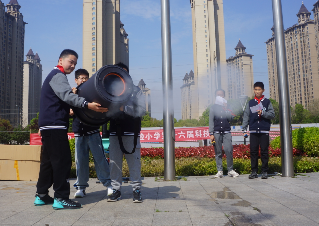 接下来,本届开始的神秘嘉宾登场了,它就是“空气炮”。夹杂着烟的空气被挤压后,向前方吐出了一个又一个“烟圈”,这些“烟圈”居然能击倒数个纸杯!学生们惊叹不已,再次感受到了力的神奇魔力!