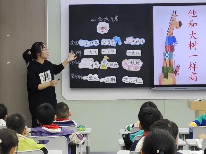 第一节课是吴妍铭老师执教的《蜘蛛开店》。课堂伊始,吴老师围绕本单元的语文要素,创设“讲故事比赛”的情境展开教学,并将这一情境贯穿于整个教学过程,充分激发学生的学习兴趣。教学中,吴老师还通过“梳理故事情节”“走进故事内容”“试讲故事片段”这三个学习任务,层层推进,任务由易到难,不断激发孩子的学习内驱力,很好地体现了“生本理念”。值得一提的是,板书在蜘蛛网上出示课文的关键内容,既吸引学生,又突出了复述故事的重点和难点,具有很强的直观性、生动性和形象性,它活生生地摆在学生面前,使学生展开联想。并且吴老师的课堂由扶到放,让学生依据学习支架自己讲讲卖蜘蛛和卖围巾的故事。在反复练说与反馈评价的过程中,学生的思维发生了碰撞,语言表达能力也得到了提升。