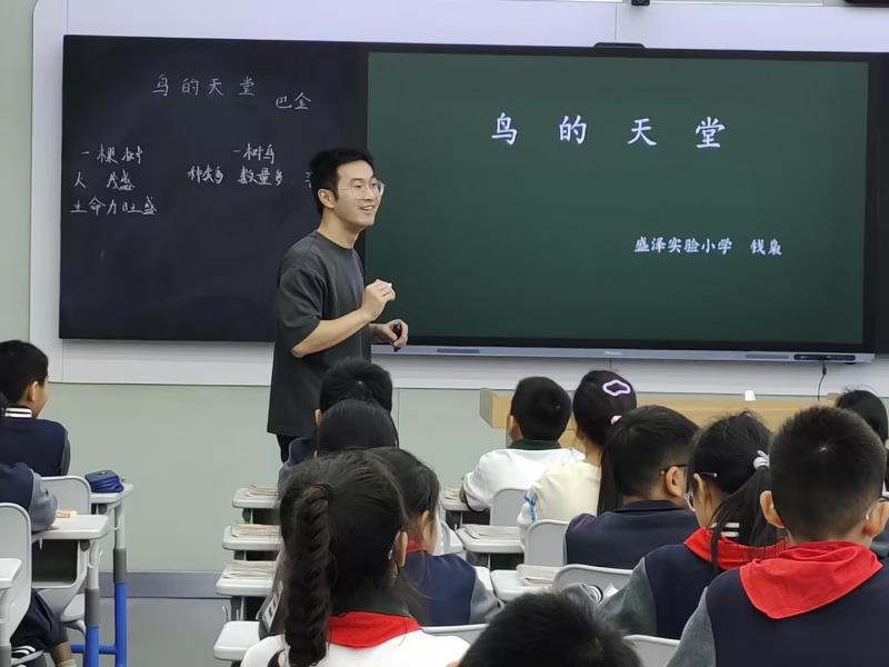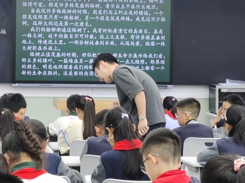 第二节课是钱枭老师执教的《鸟的天堂》。在整个课堂实施过程中,钱老师注重以学生为主体,关注学生所想、所说,不断用激励性的话语从正面加以引导,评价语新鲜贴切。钱老师创设情境,激趣导入,引发学生探究学习的兴趣。接着设置三个层层递进、相互关联的学习任务引导学生主动阅读、思考与表达。学生自读自悟学习动态描写的高明之处,从而发现动态描写的语言密码。最后,结合本单元其他课文的插图,体会动态之趣。整堂课紧扣单元训练重点,联系上下文,引导学生对重点词语、句子反复推敲、品析,使学生不仅知其然,还能知其所以然。课堂气氛轻松愉快,取得了很好的教学效果。