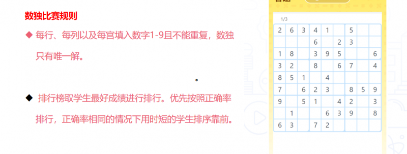 答题方式:1.出现标准九宫界面,学生需要迅速判断并将相应的数字填进去(2个)2.两个变型六宫数独,学生填写缺的数字。个人赛和团体赛的区别是个人赛是独立作答,团体赛是共用一台设备团体作答,难度上略有提升。