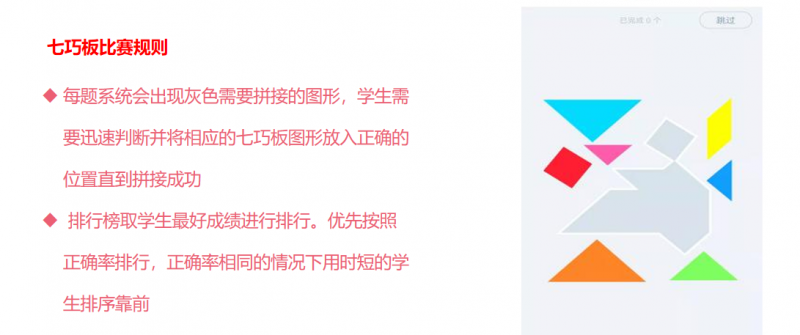 答题方式:每题系统会出现灰色需要拼接的图形,学生需要迅速判断并将相应的七巧板图形放入正确的位置直到拼接成功,学生在完成答题后提交系统会自动跳入下一题目,若出现暂时无法完成的题目可以跳过完成下一题目,跳过则系统自动判定为错误,答题时间个人赛共计7分钟,团体赛共计10分钟,可以提前完成,时间到后系统自动提交。计时统一为学生点击答题进入答题界面开始计时。