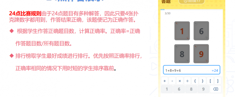 答题方式:每题出现4个数字,学生需要迅速计算用4个数字得出24点的算式,并输入答题页面,完成后点击下一题,24点比赛是学生可以进行上下题目切换题目,直到完成所有题目可以提前提交,学生点击提交后系统会统一进行所有题目正确排定,答题共计10分钟,10分钟后系统自动提交。计时统一为学生点击答题进入答题界面开始计时。个人赛和团体赛的区别是个人赛是独立作答,团体赛是共用一台设备团体作答,难度上略有提升。