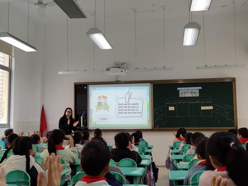 首先,张老师以一首欢快的儿歌作为课堂热身,很好地调动了氛围。儿歌之后让学生们自由表达I can...at school。在接下来的Think and say环节,张老师以zoo、farm两个场景以旧引新,引出school场景,进而引出本课标题We like our school!之后进入单词新授,张老师还为read, write编了有趣的chant。在教授到sing and dance时,张老师复习了hop, jump, run, walk,并让同学们起立跟指令做动作,提高了学生的参与度。在story time的学习中,学生们在老师的指导下进行了丰富多样的朗读:齐读、分男女生读、分小组读、分角色朗读等等。最后,张老师拓展了一本相关的课外绘本,并带着同学们一起朗读,并以课堂练习结束本课。