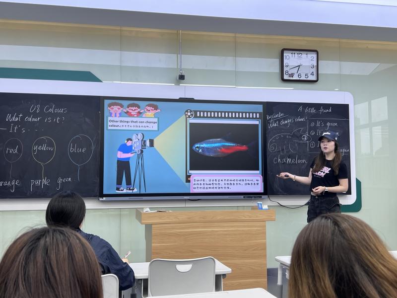 活动中,汪柳月老师执教第一课时,以丰富的环节设计层层递进,引导学生在情境中深化对颜色的感知;张婷钰老师执教第二课时,巧妙融合美术元素,通过三原色叠加向学生展示色彩变化,并关联课文“变色龙变色”的趣味情节,激发学生探究兴趣。两节课均体现“以生为本”的教学理念,课堂生动活泼。