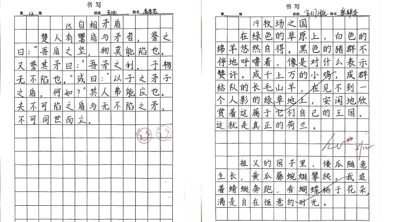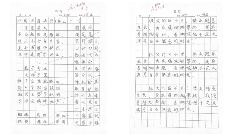 为了展示同学们的练习成果,语文组在二年级与五年级组开展了校级写字比赛。比赛当天,二年级的小选手们全神贯注,一笔一画地书写着诗歌《村居图》。工整的铅笔字、端正的结构,让老师们连连称赞。五年级的比赛内容为《祖父的园子》节选,同学们挥洒笔墨,或苍劲有力,或清秀工整。经过激烈的角逐,两个年级共七十余名同学凭借出色的表现摘得“书写之星”奖项。