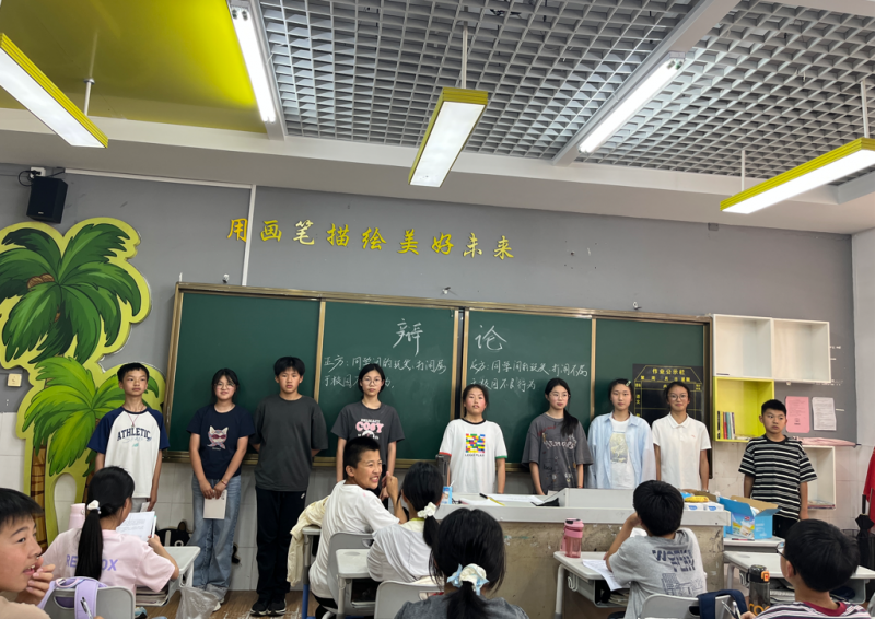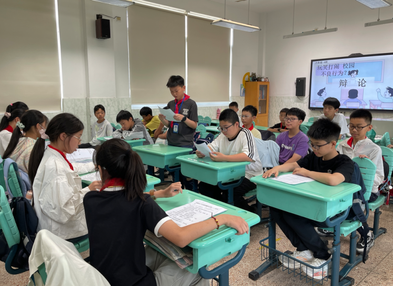 法治班会辩论赛成为本次活动的亮点。围绕 “制止校园不良行为,惩罚比教育更有效”“同学间的玩笑打闹属于校园不良行为”“抄袭作业属于青少年违法行为” 三大辩题,各班辩手展开激烈交锋。在 “制止校园不良行为,惩罚比教育更有效” 的辩论中,正方强调惩罚的威慑力,反方则以 “教育能从根源解决问题” 据理力争;针对 “同学间的玩笑打闹”,正反双方通过列举真实校园事例,就 “玩笑尺度” 展开激烈讨论;而在 “抄袭作业是否违法” 的辩论中,反方凭借对法律条文的清晰解读,指出抄袭属于违反校规的道德问题,赢得阵阵掌声。