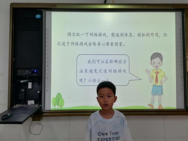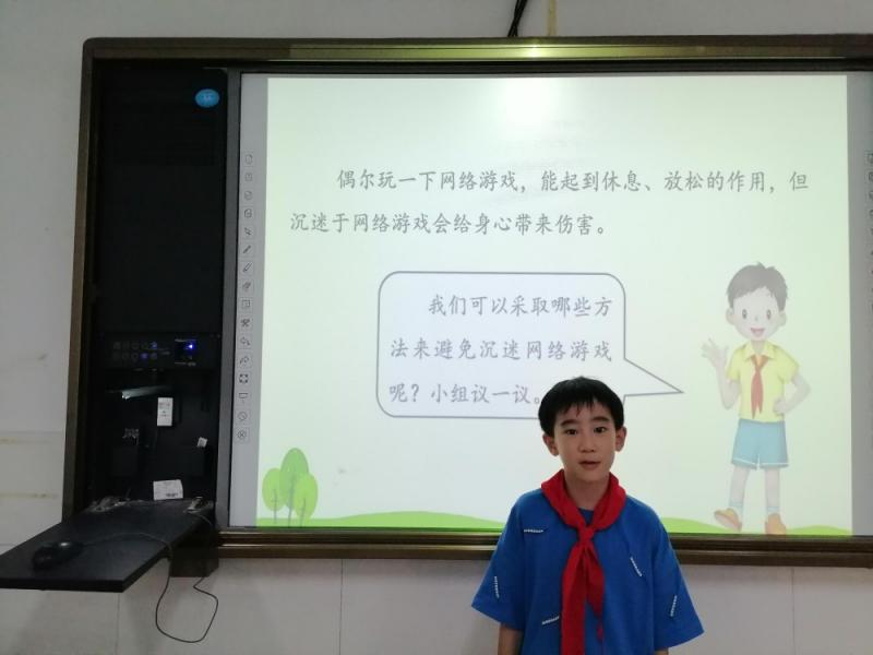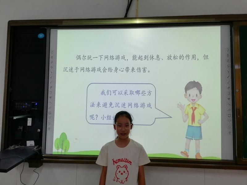 此外,老师还围绕“网络游戏有哪些危害”展开讨论,引导同学们正确看待网络游戏。老师通过真实案例,分析了过度沉迷网络游戏对小学生身心健康、学习生活的不良影响,如影响视力、导致学习成绩下降、减少与家人朋友的沟通交流等。同时,老师也鼓励同学们选择有益的娱乐方式,如阅读、运动、参加兴趣小组等,丰富自己的课余生活。