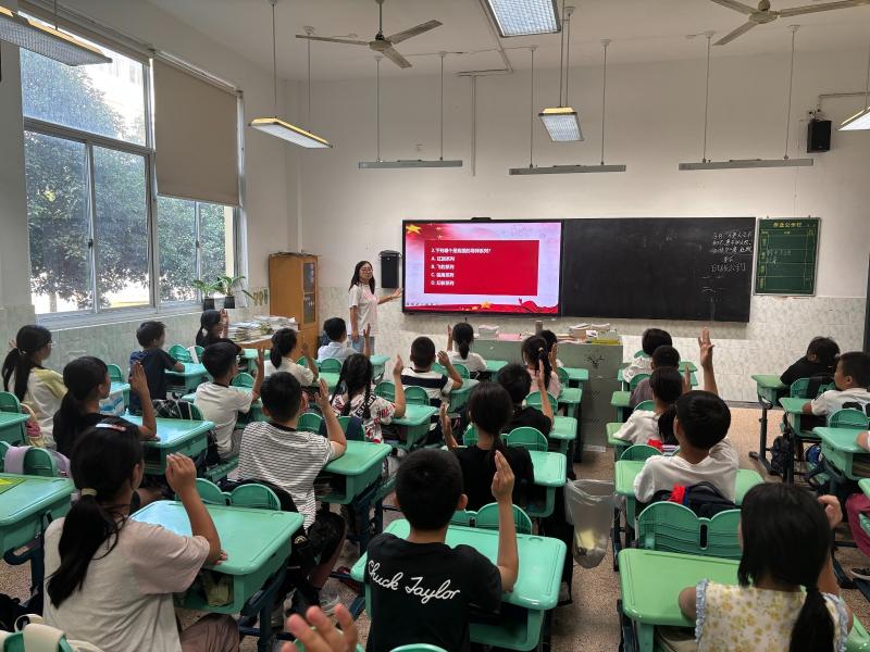 高年级的同学在班会课上参加"国防知识大比拼"活动。通过小组竞赛的形式学习国防历史、军事常识和英雄事迹,在紧张激烈的趣味竞赛中增长国防知识,培养团队协作精神。