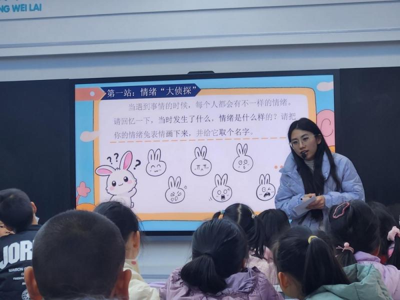 “乱发脾气会伤害到身边的人。”钱老师借助“情绪钉钉子”的动画故事,让学生理解不当表达情绪的危害;随后通过“情绪小喇叭”“情绪魔法镜”等环节,教孩子们用温和的方式表达情绪。在“解忧兔”环节,学生们纷纷说出自己的烦恼:作业太多的烦躁、体育课摔倒的委屈、童话剧落选的失落……大家互相支招,用换位思考的方式为彼此疏导情绪。