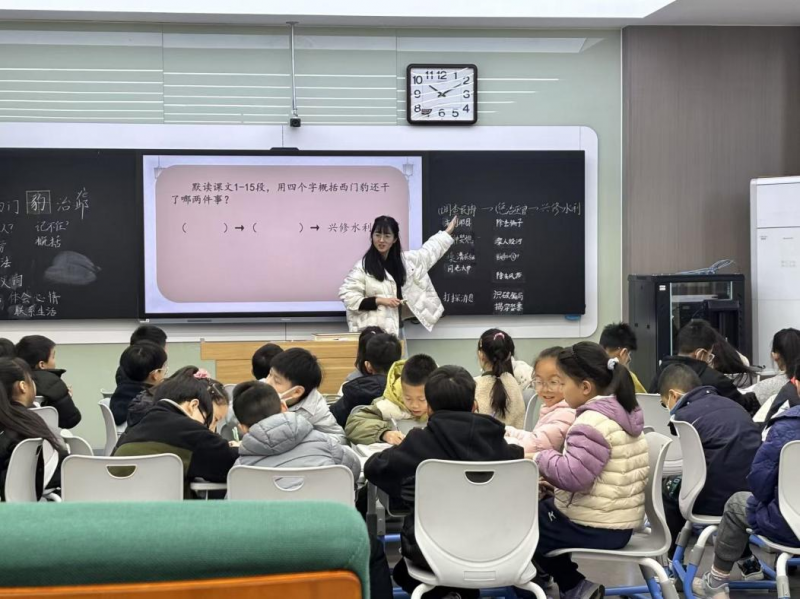 11月13日,由沈怡老师执教《西门豹治邺》,开始了语文“伙伴课堂”的第一次尝试。课上,沈老师围绕两个任务教学。先通过“读词语、默读概括”让学生概括出“调查民情、惩治巫官、兴修水利”三大核心事件;接着借助分角色朗读对话、模拟向魏王汇报民情等活动,引导学生梳理“河神娶媳妇是借口”“西门豹用反话破迷信”等信息,理解其“以民为据、以智服众”的治理智慧。
