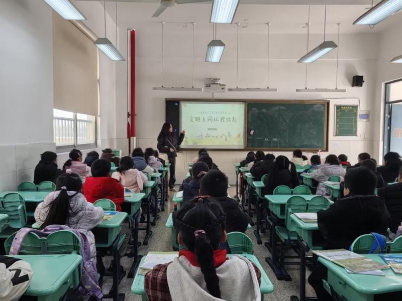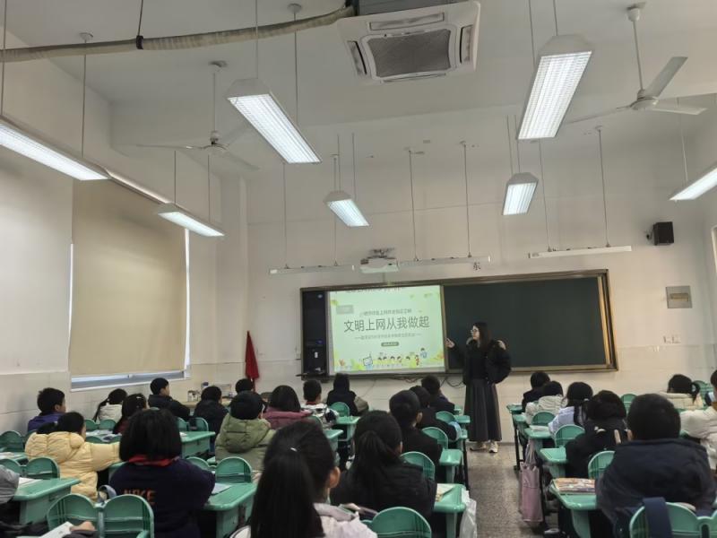在文明上网指引环节,班主任老师提出“十不”文明上网要求,带领全体学生学习《青少年文明上网公约》,并给出实用建议:明确上网目的、控制上网时长、不将网络当现实、慎重网上交友、远离不良信息,引导学生增强自我保护意识和自律意识。